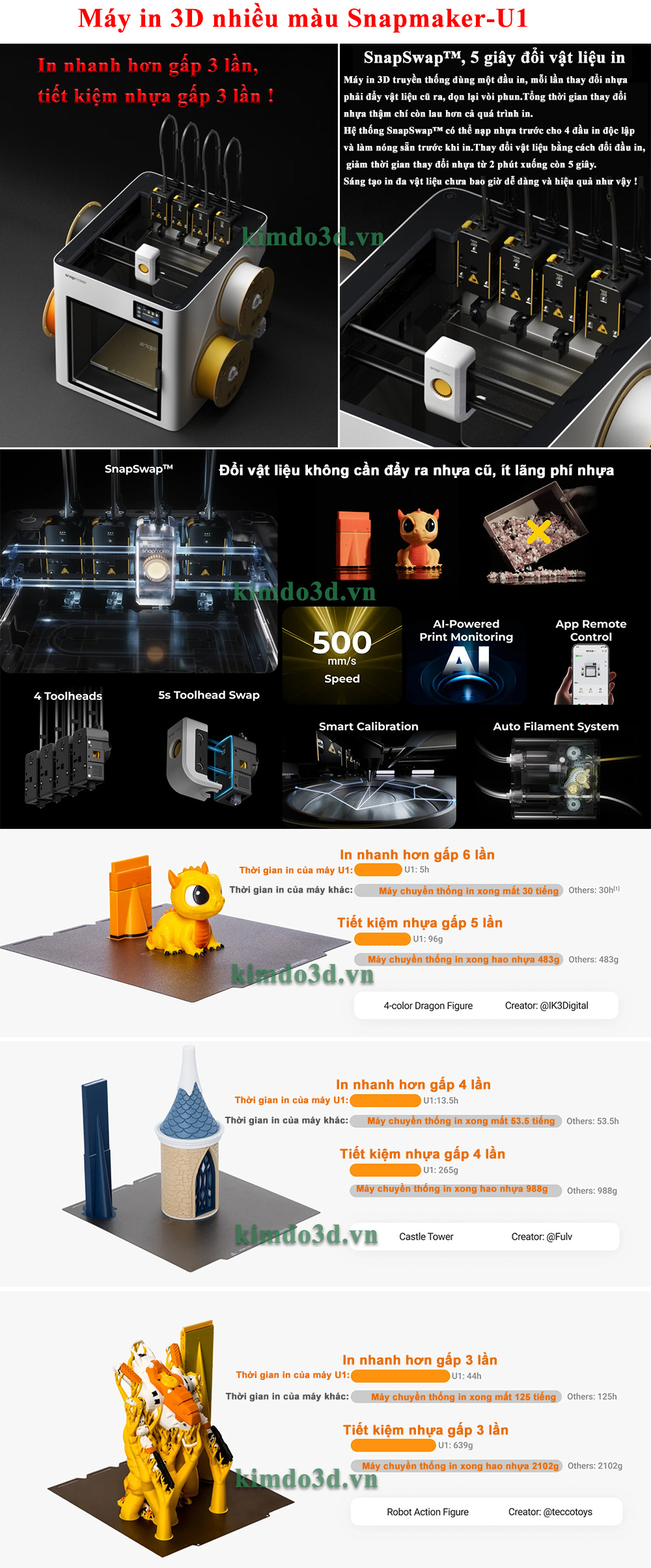 (1)In mô hình đa màu cần đổi màu liên tục rất có ưu thế. Nhanh gấp 3-5 lần so với máy in 3D truyền thống, giảm nhựa thải gấp 3 lần, tiết kiệm giá thành. Hiệu xuất in đa màu 1 máy bằng 3 con máy in 3D truyền thống.
